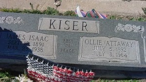 OLLIE OTHELLA ATTAWAY was born July 05, 1892 in Suez, Comanche County, TX, and died July 03, 1964 in Eldorado, Schleicher County, TX. She was the seventh child born to John W. Attaway and Matilda Virginia Northcutt. She married JAMES ISAAC KISER November 10, 1910, son of JESSIE KISER and KATIE JONES. He was born September 18, 1891 in Mason, Mason County, TX, and died March 23, 1938 in Eldorado, Schleicher County, TX.