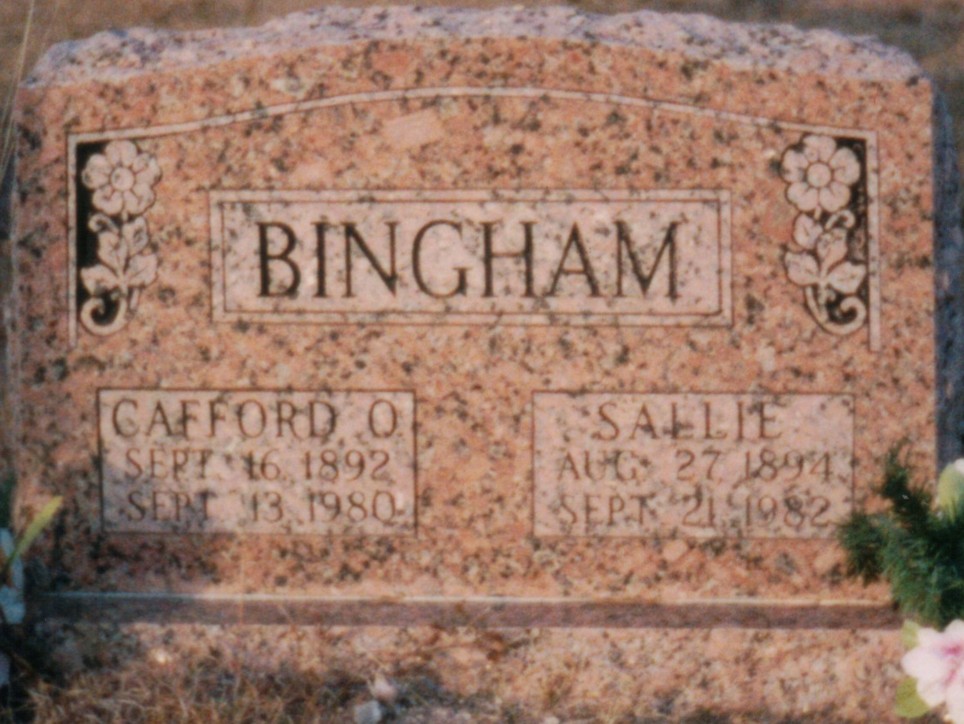 CAFFORD OWEN BINGHAM was born September 16, 1892 in Harper, Gillespie County, TX., and died September 13, 1980 in Brady, McCulloch County, TX. He was the third child born to Mack David Bingham and Benson Bellzora (Belle) Wilson Bingham. He had five brothers and six sisters. He married SALLIE ATTAWAY November 03, 1911 in Shelby County, TX, daughter of JOHN ATTAWAY and MATILDA NORTHCOTT. She was born August 27, 1894 in Comanche, Comanche County, TX., and died September 21, 1982 in Brady, McCulloch County, TX. Cafford and Sallie had five chidren – two boys and 3 girls. The youngest, Johnnie Mac, died of pneumonia when he was three years old.