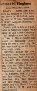 JAMES NEFF BINGHAM was born February 10, 1906, and died January 15, 1964 in Brady, McCulloch County, TX. He married NORA ODELLE SMITH 1925 in McCulloch County, TX. She was born September 25, 1907, and died September 03, 1973 in McCulloch County, TX. He was the tenth child born to David Mack Bingham and Benson Bellzora (Belle) Wilson Bingham.