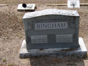 JOHN HENRY BINGHAM was born June 1, 1862 in Milam County, TX and died May 19, 1947 in Austin, Travis County, TX. He married MARTHA A. YOUNG August 26, 1886. She was born February 15, 1870 in Arkansas and died Jan 21, 1938 in Kingsbury, Guadalupe County, TX. He was the seventh child and fifth son born to James S. Bingham and Lavica Ann Dyches Bingham.