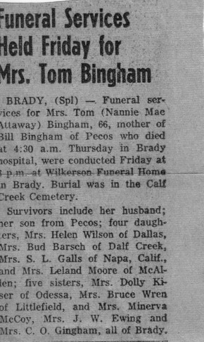 THOMAS JEFFERSON BINGHAM was born May 07, 1888 in Williamson County, TX, and died May 05, 1966 in Brady, McCulloch County, TX. He was the first child born to Mack David Bingham and Benson Bellzora Wilson. He married NANNIE MAY ATTAWAY, daughter of JOHN W. ATTAWAY and MATILDA NORTHCOTT. She was born June 02, 1890 in Suez, Comanche County, TX, and died February 21, 1957 in McCulloch County, TX. They had 5 children. Tom’s brother, Cafford Owen Bingham, married Nannie May’s sister, Sallie Attaway. All four of them are buried in Calf Creek Cemetery, Calf Creek, McCulloch County, TX.