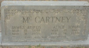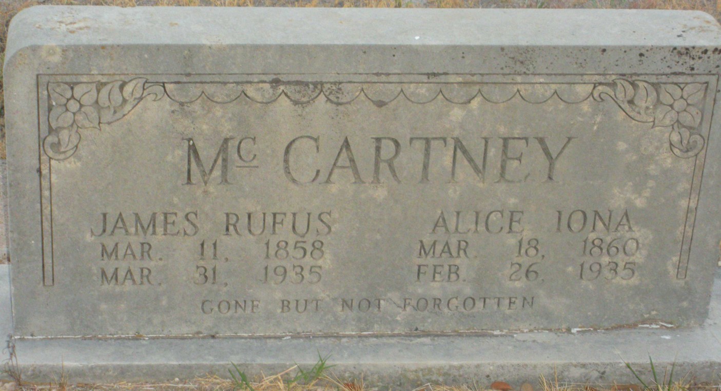 ALICE IONE BLOUNT was born March 18, 1859 in Montgomery County, TX, and died February 26, 1935 in Eden, Concho County, TX. She was the second daughter and fourth child of James Koen Blount and Lydia Ann Moore. She married JAMES RUFUS MCCARTNEY September 01, 1881 in Llano County, TX. He was born March 11, 1858 in DeWitt County, TX, and died March 31, 1935 in Eden, Concho County, TX. They were buried in Eden Cemetery.