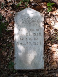 William C. Dyches was born June 22, 1798 in South Carolina, probably in Abbeville District, and died August 10, 1854 in Bell County, TX. He was buried in Dyches Cemetery in Bartlett, Bell County, TX. He was the son of Josiah Dyches and Lucinda Taliaferro?.