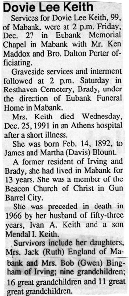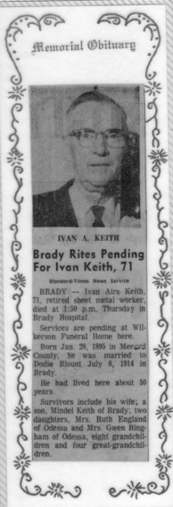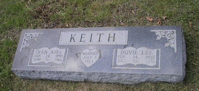IVAN AIRS KEITH was born January 28, 1895 in Concho County, TX, and died June 02, 1966 in Brady, McCulloch County, TX. He was the second child born to WILEY H. KEITH and EMILY CATHERINE HOLLIDAY. He married DOVIE LEE BLOUNT July 08, 1913, daughter of JAMES KOEN BLOUNT, Jr. and MARTHA DAVIS. She was born February 14, 1892 in Llano, Llano County, TX, and died December 25, 1992 in Mabank, Henderson County, TX.