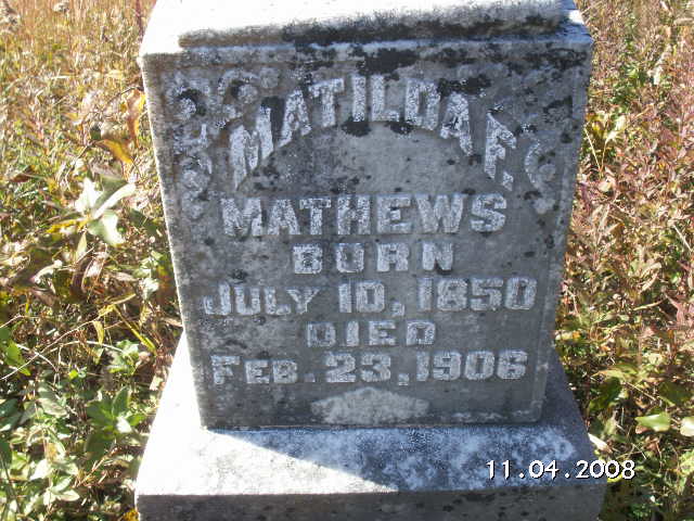 Elijah Andrew Jackson Mathews was born 11 Aug 1854 in Alabama, and died 19 Apr 1927 in Bedford County, TN.  He was the son of WILLIAM R. MATHEWS and ELIZABETH J. (Unknown).  He married MATILDA FRANCIS HOLDEN June 12 1872 in Tennessee.  She was born 10 Jul 1850 in Tennessee, and died 23 Feb 1906 in Tennessee.