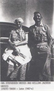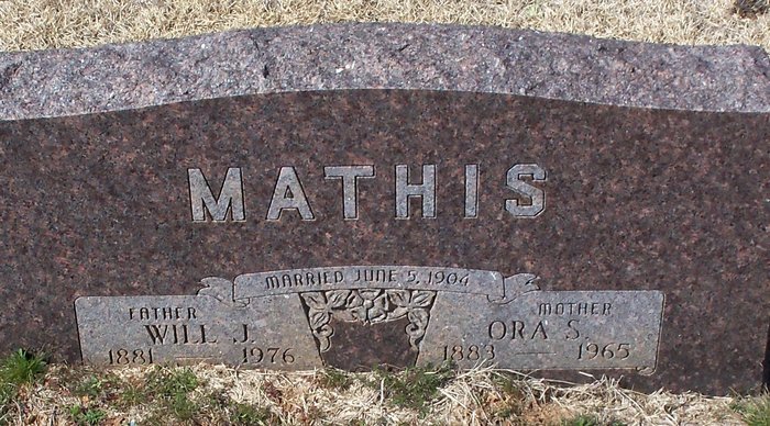 WILLIAM JACKSON MATHIS was born 08 Dec 1881 in Johnson City, Washington County, AR, and died 13 Jan 1976 in Ozark, Franklin County, Arkansas. He was the son of Elijah Andrew Jackson Mathews and Elizabeth J. (Unknown). He married ORA STEPHENSON, daughter of TOM STEPHENSON and LAURA STEVENSON. She was born 02 Jun 1883 in Georgia, and died 26 Jul 1965 in Altus, Franklin County, Arkansas.