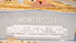 JOEL B. NORTHCOTT (Source: 1900 census Comanche County, TX Precinct #1 ED #26 Sheet #12.), b. 25 Jul 1891, Comanche County, TX; d. 12 Sep 1974, Comanche County, TX. He married Rosie M. (Unknown), born Nov. 12, 1892 and died Oct. 16, 1967. They had at least one child, Alvie F. Northcott born May 12, 1914 and died Mar 24, 1971.